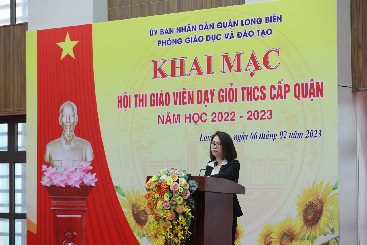 Dự khai mạc Hội thi Giáo viên dạy giỏi THCS quận Long Biên năm học 2022-2023 có đồng chí Vũ Thị Thu Hà - Trưởng phòng GD&ĐT, đồng chí Đào Thị Hoa - Phó Trưởng phòng GD&ĐT, các đồng chí chuyên viên phòng GD&ĐT, đại diện BGH các trường THCS, thành viên BGK Hội thi và 104 giáo viên tiêu biểu tham gia dự thi đến từ tất cả các trường THCS trên địa bàn quận.