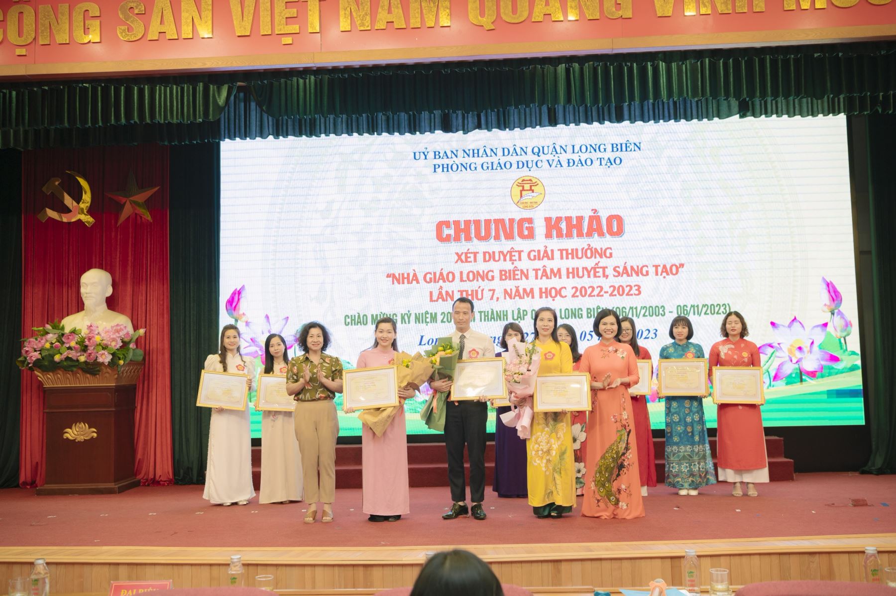 Chào mừng kỷ niệm 20 năm ngày thành lập quận Long Biên ( 06/11/2003-06/11/2023) sáng ngày 27/5/2023, tại hội trường Khu Liên cơ UBND quận Long Biên, Phòng GD&ĐT quận Long Biên tổ chức Chung khảo xét Giải thưởng “Nhà giáo Long Biên tâm huyết, sáng tạo” năm học 2022-2023. Tham dự Hội nghị có TS. Nguyễn Ngọc Ân - Chủ tịch Công đoàn Giáo dục Việt Nam; TS.Trần Thị Thu Hà- Chủ tịch Công đoàn ngành GD Hà Nội; đồng chí Đinh Thị Thu Hương- UVBTV, Phó Chủ tịch UBND quận Long Biên; đồng chí Nguyễn Thị Kim Định- UVBTV, Phó Chủ tịch HĐND Quận, các đồng chí lãnh đạo các phòng, ban ngành Quận, đại diện Lãnh đạo Phòng GD&ĐT huyện Mê Linh, các đồng chí chuyên viên phòng GDĐT quận; Các đồng chí Hiệu trưởng, Chủ tịch Công đoàn, TPT các trường MN, TH, THCS của Quận và đặc biệt là sự có mặt của 10 thí sinh tham dự xét duyệt chung kết giải thưởng.