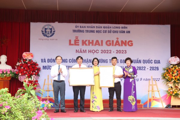 Nhân dịp khai giảng năm học mới 2022-2023, 07 đơn vị tiêu biểu của các cấp học quận Long Biên (MN Gia Quất, MN Long Biên A, MN Long Biên, MN Tràng An; TH Gia Quất, TH Đoàn Kết; THCS Chu Văn An) vinh dự được đón các đồng chí lãnh đạo Quận ủy- HĐND- UBND Quận, các ban ngành của Quận đến dự Lễ khai giảng, trao Bằng công nhận trường đạt chuẩn quốc gia. Thay mặt cho Quận Ủy - HĐND - UBND quận Long Biên, các đồng chí lãnh đạo Quận đã tặng hoa chúc mừng các nhà trường nhân dịp năm học mới.
