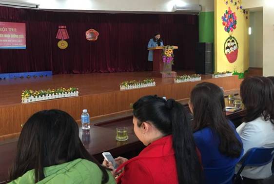 Tham gia Hội thi giáo viên dạy giỏi – Nhân viên nuôi dưỡng giỏi cấp Quận năm học 2016 - 2017, mỗi giáo viên sẽ thực hiện 2 phần thi với tổng số điểm là 40 điểm. Phần thi lý thuyết (10 điểm), giáo viên làm bài trắc nghiệm nội dung về các quy định trong Điều lệ trường mầm non, Quy chế nuôi dạy trẻ, quy định về chuẩn nghề nghiệp giáo viên mầm non, nhiệm vụ năm học 2016 - 2017 cấp học mầm non Quận Long Biên, xử lí tình huống sư phạm. Phần thi thực hành (30 điểm), giáo viên thực hiện 01 hoạt động học (rút thăm đề tài) và hoạt động khác do Ban giám khảo chỉ định (tổ chức hoạt động vui chơi, hoạt động ngoài trời, tổ chức giờ ăn, hoạt động chiều) theo quy định trong chương trình Giáo dục mầm non.