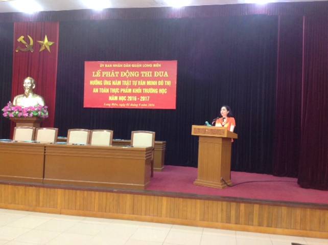 Tại lễ phát động, đồng chí Lưu Thị Bích Hằng - Trưởng phòng GD&ĐT Quận thông qua kế hoạch số 267/KH-UBND ngày 30 tháng 8 năm 2016 của UBND quận Long Biên về thực hiện Trật tự văn minh đô thị, an toàn thực phẩm khối trường học quận Long Biên năm học 2016-2017.