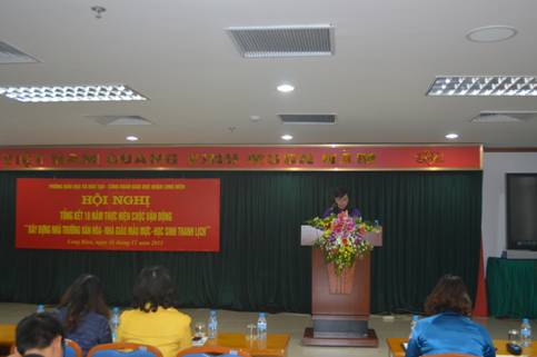 Thay mặt Ngành Giáo dục và Đào tạo quận Long Biên, đồng chí Lưu Thị Bích Hằng - Trưởng phòng Giáo dục và Đào tạo quận đã cảm ơn sự quan tâm chỉ đạo của Công đoàn giáo dục Hà Nội, sự quan tâm chỉ đạo của Đảng uỷ - HĐND- UBND Quận, đồng thời đưa ra những quyết tâm của Ngành Giáo dục và Đào tạo Quận trong triển khai nhiệm vụ trọng tâm đẩy mạnh cuộc vận động trong thời gian tới.