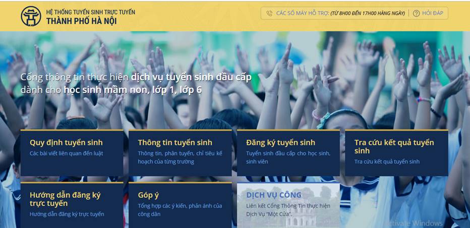 http://tsdaucap.hanoi.gov.vn/. Để có thể truy cập đăng kí trực tuyến, với các trường hợp TS lớp 1 và lớp 6 , Sở GD&ĐT đã mã hóa toàn bộ thông tin cá nhân của HS căn cứ theo hộ khẩu và nơi ở được cha mẹ khai từ tháng 02/2019. Mỗi HS sẽ được cung cấp 1 mã đăng kí trực tuyến, được phép sử dụng 1 lần duy nhất. CMHS nhận mã HS vào lớp 1 tại trường MN, HS tuyển lớp 6 nhận tại trường Tiểu học nơi HS đã học năm học 2018-2019. Riêng với trẻ nhập học mầm non, CMHS có thể đăng kí trực tuyến cho con mà không cần sử dụng mã tuyển sinh. Thời gian đăng ký tuyển sinh trức tuyến cấp Mầm non 5 tuổi từ 04/7/2019 đến 06/7/2019; lớp 1 từ ngày 01/7/2019 đến 03/7/2019; lớp 6 từ ngày 07/7/2019 đến 09/7/2019.