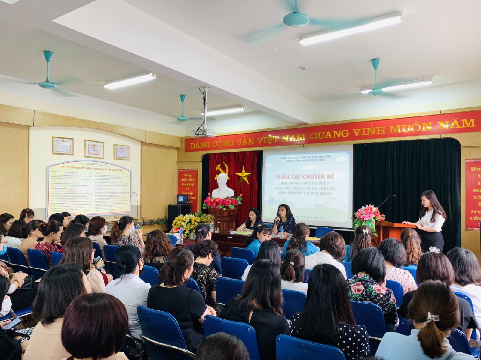 Thực hiện nhiệm vụ năm học 2020-2021, thực hiện kế hoạch bồi dưỡng thường xuyên cho đội ngũ CBQL và giáo viên cốt cán giáo viên mầm non. Sáng ngày 13/4/2021 và ngày 14/4/2021 phòng GD&ĐT quận Long Biên tổ chức kiến tập chuyên đề “Ứng dụng phương pháp giáo dục tiên tiến trong việc tổ chức các hoạt động giáo dục cho trẻ ở trường mầm non” tại trường mầm non chất lượng cao Đô Thị Sài Đồng và MN Đô thị Việt Hưng.
