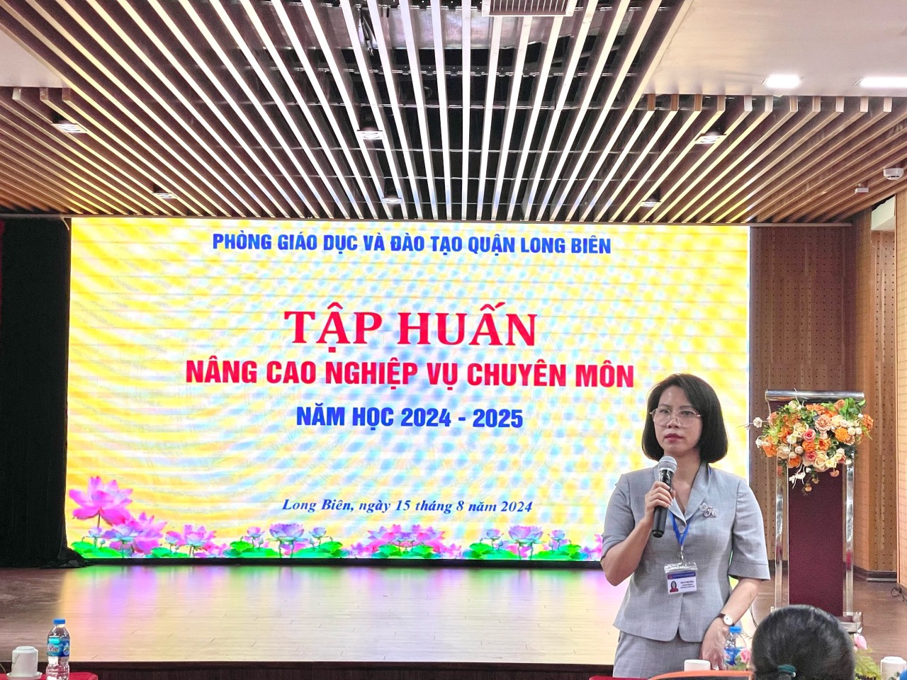 Với mục đích hỗ trợ GV môn Tiếng Anh cấp THCS Quận Long Biên nâng cao chuyên môn, nắm vững việc thực hiện chương trình GDPT 2018 đối với môn Tiếng Anh, ngày 15/8/2024, Phòng GDĐT Quận Long Biên tổ chức tập huấn chuyên sâu cho 100% giáo viên dạy Tiếng Anh THCS trên toàn Quận.